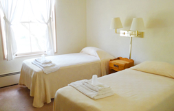 Comfortable single occupancy bedrooms have been recently renovated. Each private bathroom has two comfortable twin beds with pillows, linens, extra blankets. The bathroom includes a shower, towels, bath mat, washcloths, and soap. A desk and chair with reading lights. Each room has a large window facing a garden. The ambience is quite and ideal space for secluded seated meditation practice. These rooms have covered access to group meditation spaces and the mission style chapel. The meditation hall is available for 24 hour practice. There is ample indoor walking space in the event of rain. Shaded and open air walk ways offer abundant space for sitting and walking practice.